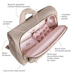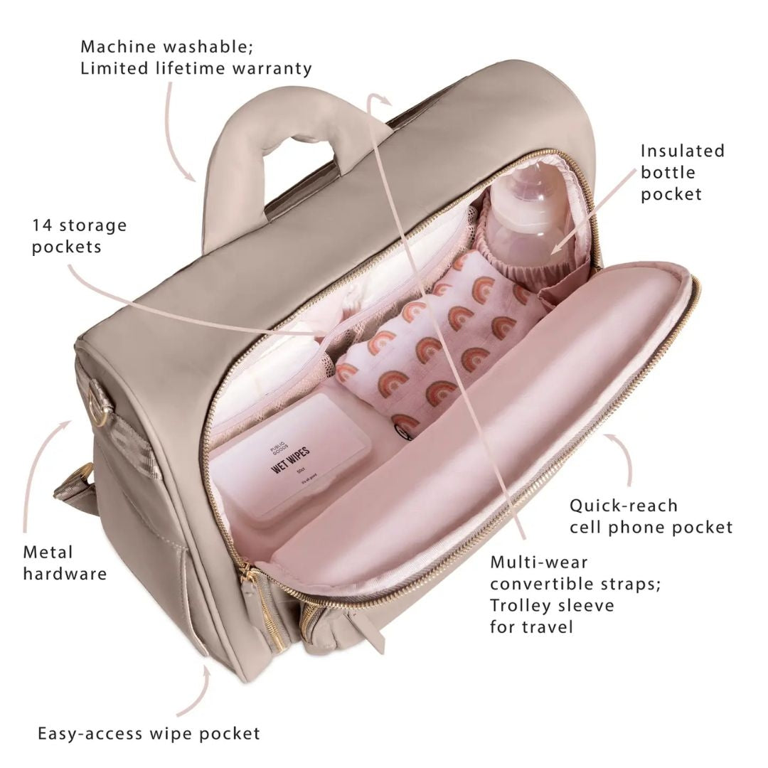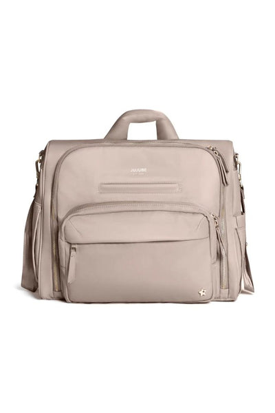 The Satchel from JuJuBe features a lightweight, versatile construction with 14 storage compartments, removable stroller straps, and a trolley sleeve for travel, all in a distinctive silhouette. Convertible straps make it wearable in three different ways—as a satchel, backpack, and messenger bag—so you can keep diapers, clothes, snacks, toys, and more organized in style and comfort. The insulated bottle pocket keeps drinks and snacks at the perfect temperature, while the water-repellent and odor-resistant lining and durable metal hardware make it sturdy enough for any adventure.