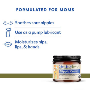 We've tried many nipple balms and this is one of our all-time faves. Soothing relief for painful, cracked nursing nipples. Motherlove Organic Nipple Cream provides a rich, protective layer without being greasy or sticky. With 100% USDA Certified Organic ingredients, there is no need to wash off this salve prior to feeding or pumping.