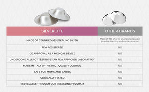 SILVERETTE ® are small cups crafted out of pure 925 silver that fit over and help to protect nipples while breastfeeding. Essential for preventing and treating sore or cracked nipples while nursing.