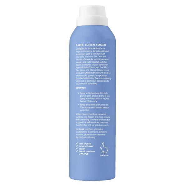 Designed for an active lifestyle, our high performance, dermatologist tested sunscreen spray is formulated with reef safe, non-nano Zinc Oxide and Titanium Dioxide for up to 80 minutes of sweat and water-resistant protection. Works to create a physical barrier from harmful UVA/UVB sun rays.